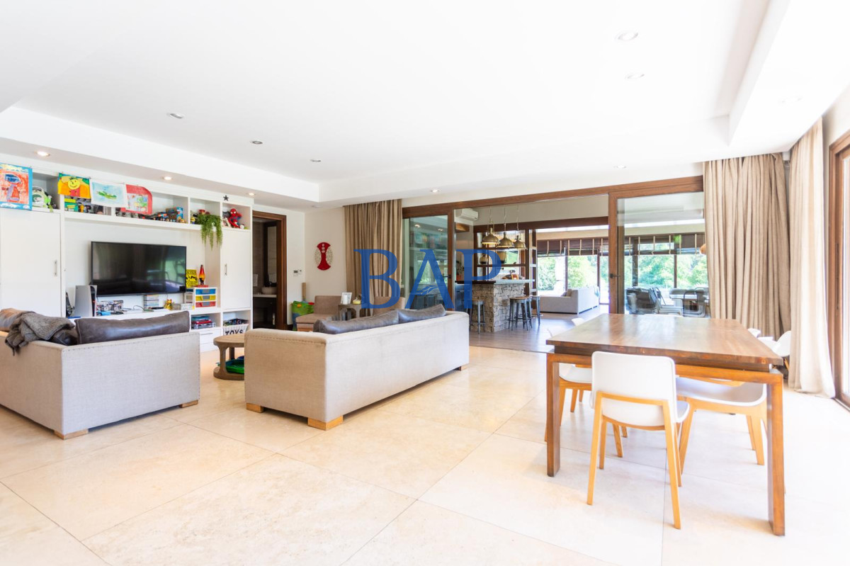 Cuenta además con un bungalow con parrillero y baño, integrado a la casa y con salida directa al área exterior. En la planta alta, un hall de distribución conecta un segundo estar con los cinco dormitorios, cuatro de ellos en suite.
